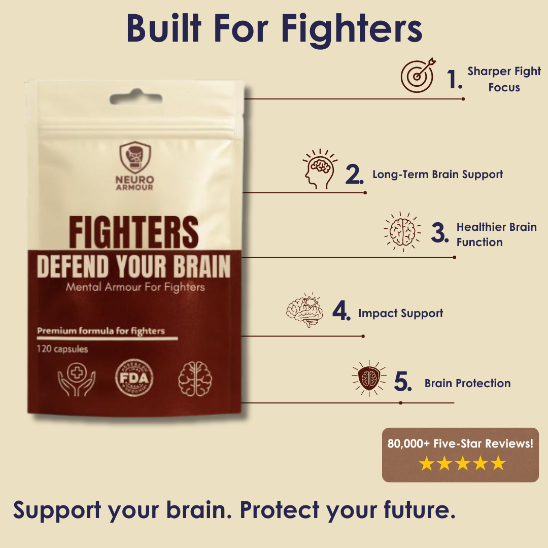 NeuroArmour is built for fighters, students and coaches who want to look after their brain over the long term. It’s designed to support mental clarity, focus, and overall brain health through hard training, busy days, and life outside the ring.